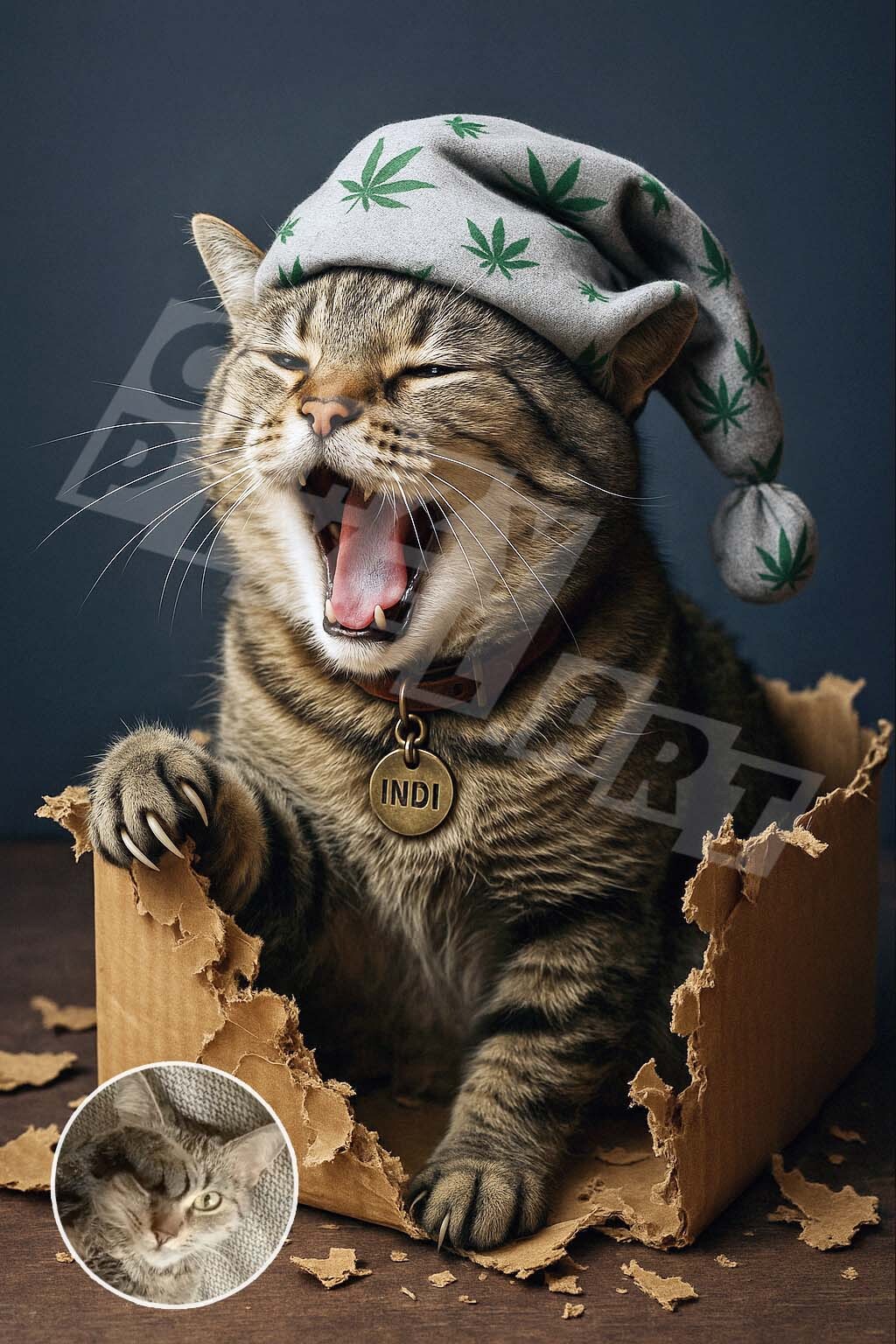 Ten futrzasty bohater ma jeden życiowy cel: ujarzmić każdy karton, który stanie mu na drodze. Żadne pudełko nie jest bezpieczne, gdy Indi wkracza do akcji – rozszarpywanie to jej sport, a chowanie się w kartonowych ruinach to ulubione hobby. Ale nie daj się zwieść jego wojowniczemu zacięciu! Indi to prawdziwy domowy towarzysz – przytulas, strażnik drzwi i kot, który zawsze czeka na swojego Pana jak wierny pies. Gdy tylko usłyszy znajomy krok, biegnie niczym kartonowy ninja, żeby się przywitać… lub przypadkiem podstawić się pod nogi. Z szlafmycą na głowie i triumfalnym ziewnięciem, Indi króluje w swoim poszarpanym królestwie – z kartonu.
